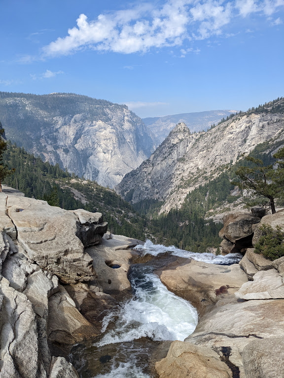 Clark Point is an unbelievable vista, with a view of Nevada Fall and Half Dome in the distance across a valley. Even though we had been on the trail for 2 hours, we were just getting started. Continuing onwards, we take the John Muir Trail another couple of miles to the top of Nevada Fall, where we stop for a trail breakfast. I was surprised that we still had cell service at this point. I had been to Yosemite once before, in 2018, and cell service was non-existent, but I suppose they’ve since brought service to the Valley to the pleasure of Instagrammers everywhere.