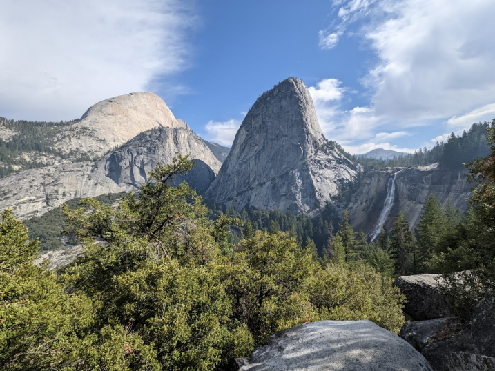 It’s now 2 days later and my friends and I are in our Upper Pines Yosemite campground preparing to set off to the trailhead of the John Muir trail. We hit the trail at about 8:30am and begin our approximately 18 mile round-trip journey. The first 2 miles or so of the trail are fairly paved, along with some rocks and dirt, and gravel. It became quickly apparent that we would be walking uphill for most of this journey, which makes sense considering the whole hike was about 5,000′ of elevation gain. We stop maybe once or twice for a moment, though make our first snack break at Clark Point.